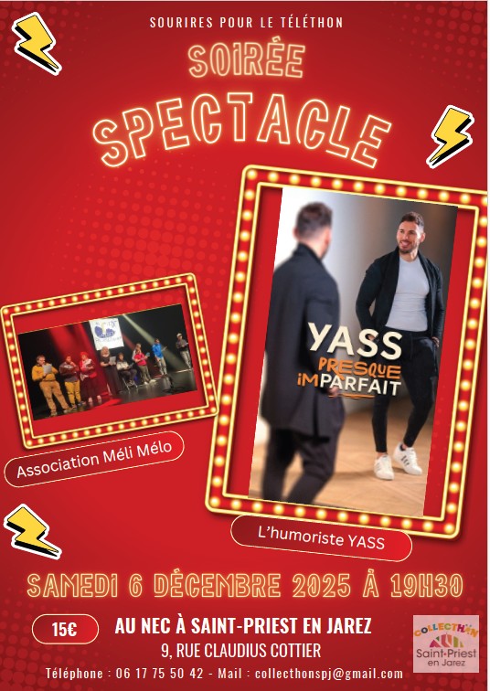 La journée se clôturera en beauté dès 19h30 avec une soirée placée sous le signe du divertissement ! Préparez-vous à rire avec un spectacle de One Man Show de Yass, précédé d’une première partie animée par Méli-Mélo. Une buvette sera à votre disposition tout au long de la soirée pour vous rafraîchir. C’est également pendant cette soirée que se déroulera le très attendu tirage de la tombola.