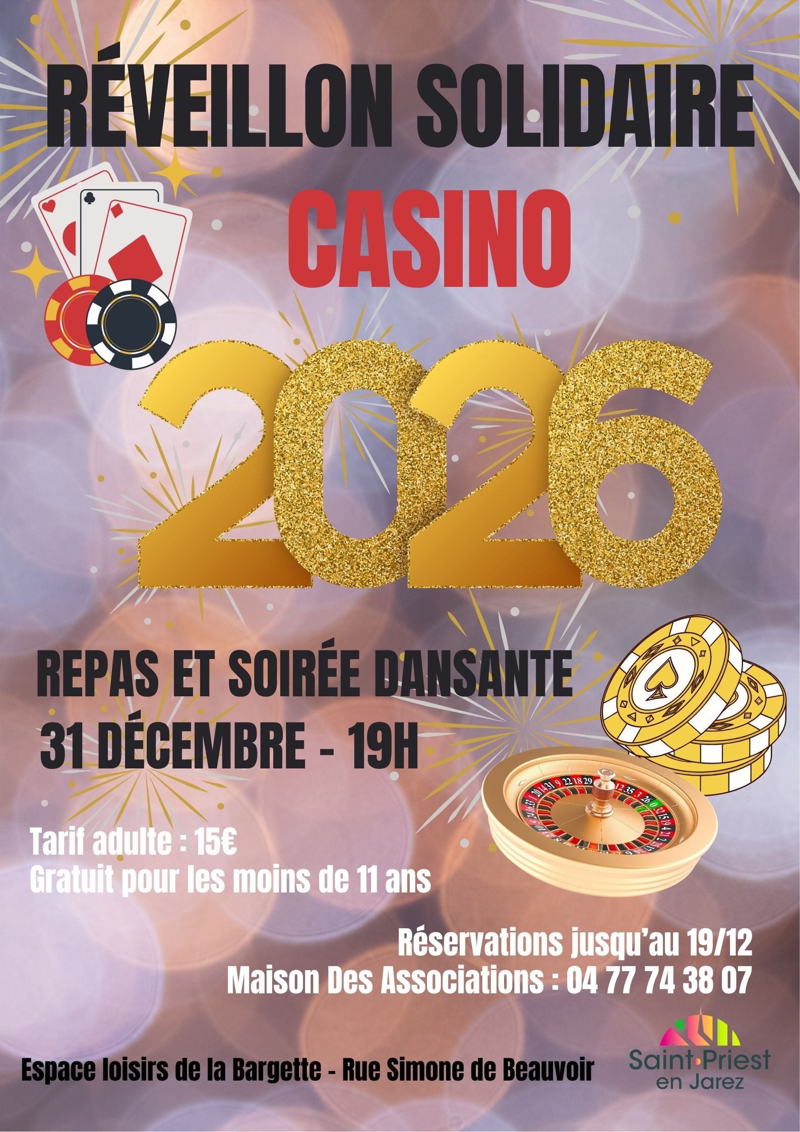 Mercredi 31 décembre à 19h à l’Espace Loisirs de la Bargette. Adulte : 15 €, gratuit pour les moins de 11 ans. Réservations jusqu’au 19 décembre à la Maison Des Associations au 04 77 74 38 07